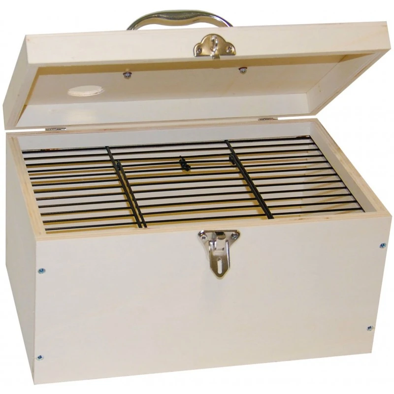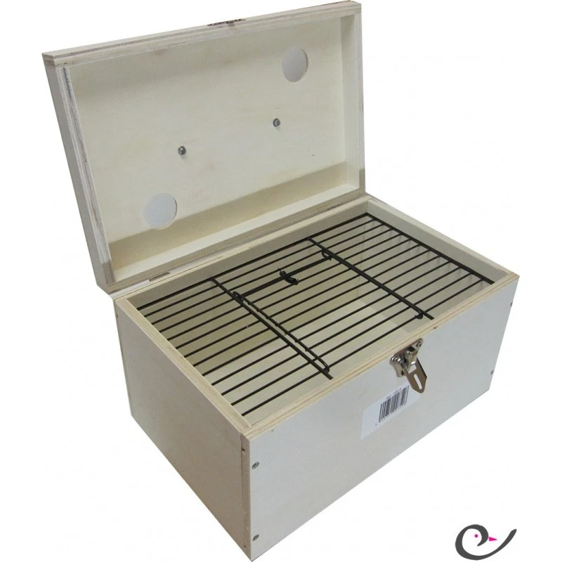 Cageot en bois avec poignée de transport. Aération prévue. Grille noire avec porte à ressort.