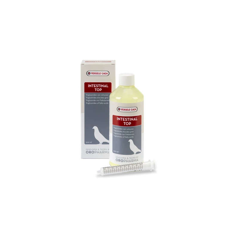 Intestinal Top est un complément alimentaire dont la formulation scientifique est basée sur des acides gras à chaîne moyenne estérifiés. Une combinaison idéale d’acide butyrique, d’acide caprylique, d’acide caprique et d’acide laurique, estérifiés de manière à ce qu’ils soient faciles à assimiler. Assure un microbiote intestinal optimal en freinant la prolifération de micro-organismes nuisibles. L’administration quotidienne favorise le bon fonctionnement des intestins et augmente la résistance aux problèmes digestifs (notamment chez les jeunes pigeons).