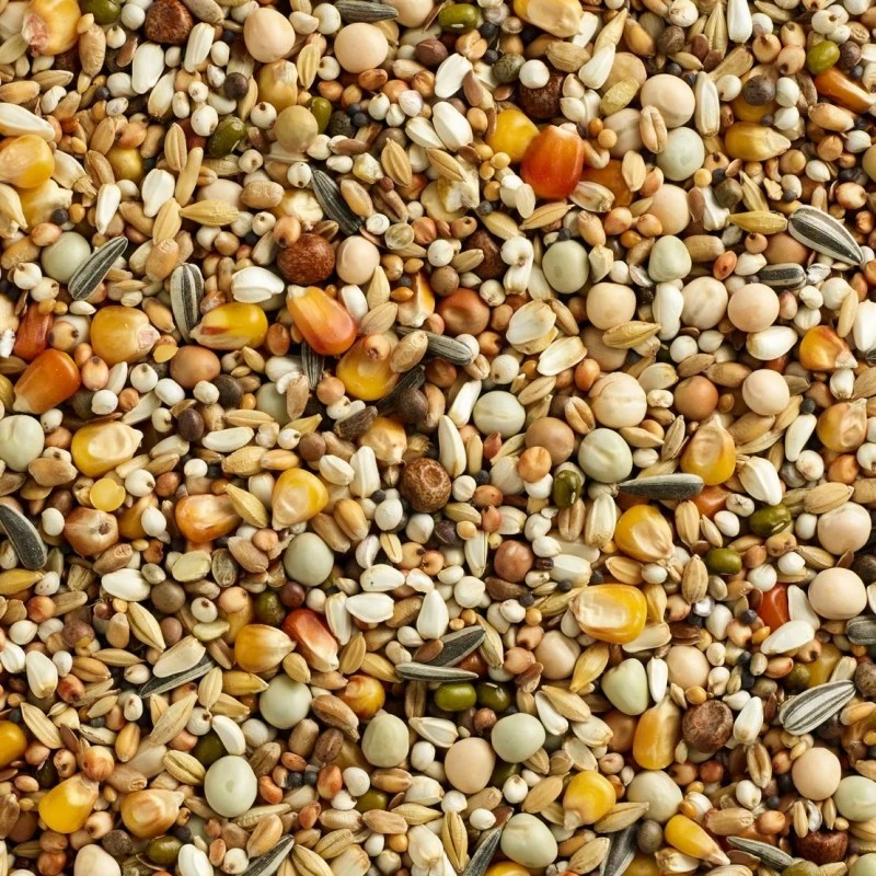 Un mélange de mue hautement varié, riche en petites graines, avec du maïs cribs et orange