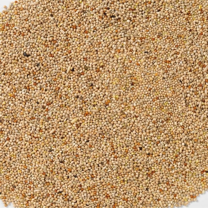 Millet jaune 45%, millet blanc 40%, avoine pelée 5%, Alpistes 5%, millet rouge 5%